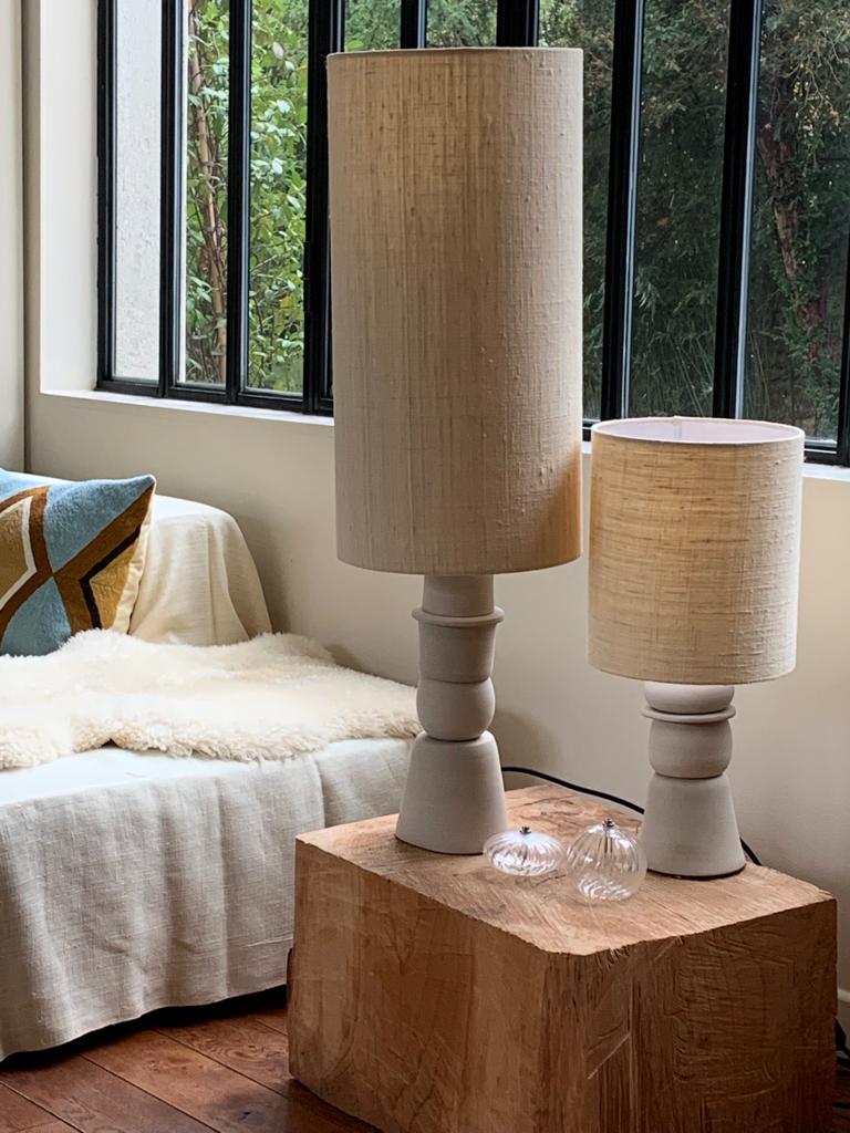 Mes abats-jours souvent volontairement surdimensionnés de par leur hauteur et leur diamètres sont toujours de forme simple pour venir souligner le volume des lampes. Pour autant, j’accord énormément d’importance aux tissus de ces abats-jours qui sont pour la plupart en soie sauvage pour qu’il y est une certaine matière quand les lampes sont éclairées.